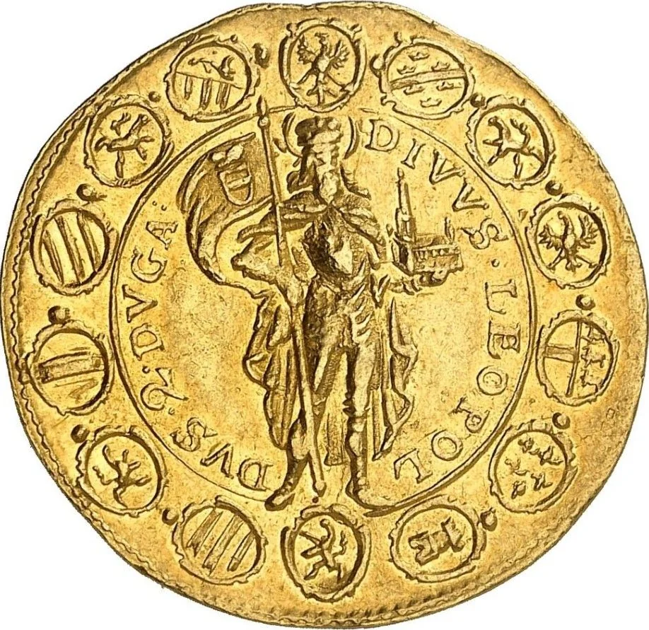 St. Leopold holding a banner and church model, encircled by fourteen shields (clockwise from top: Tyrol, Alsace, Habsburg, Prussia, Carinthia, Old Austria, Castile, Leon, Hungary, Bohemia, Austria, Burgundy, Styria, Gorizia) around a plain center.