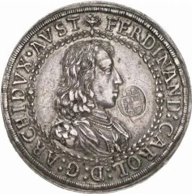Portrait of Ferdinand Karl of Habsburg facing right, a lion's head on his shoulder, no crown, within a leaved circle. Countermark 16S81.