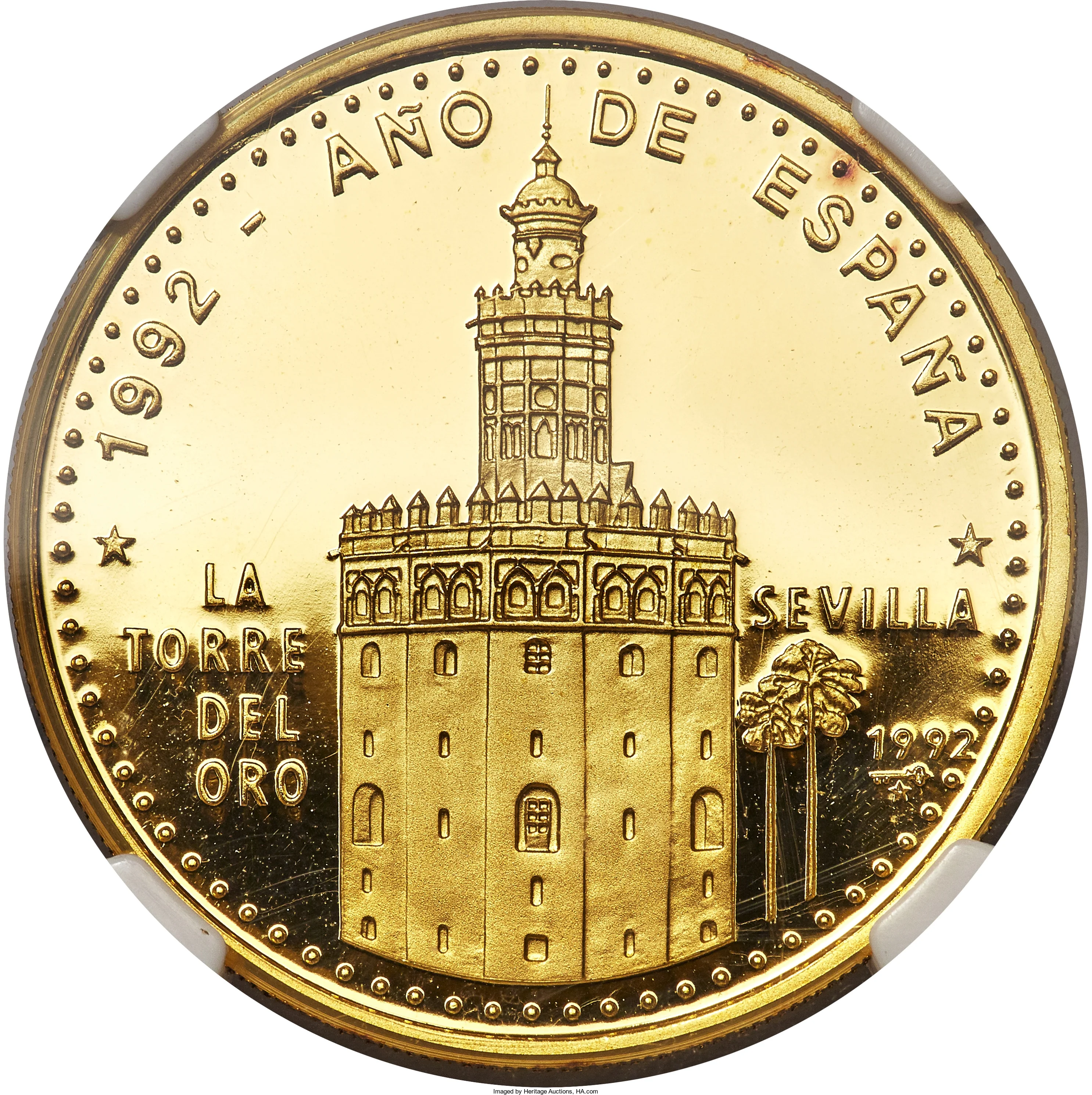 Gold Tower at center, circular legend above, place name left, city and year right, bead circle near edge.