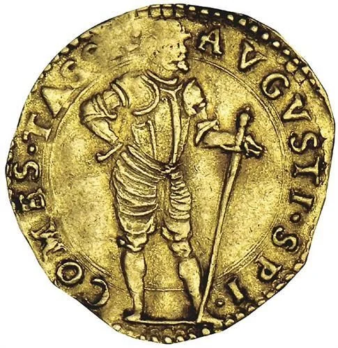 Full-length armored count facing right, holding a downward-pointed sword in his left hand.