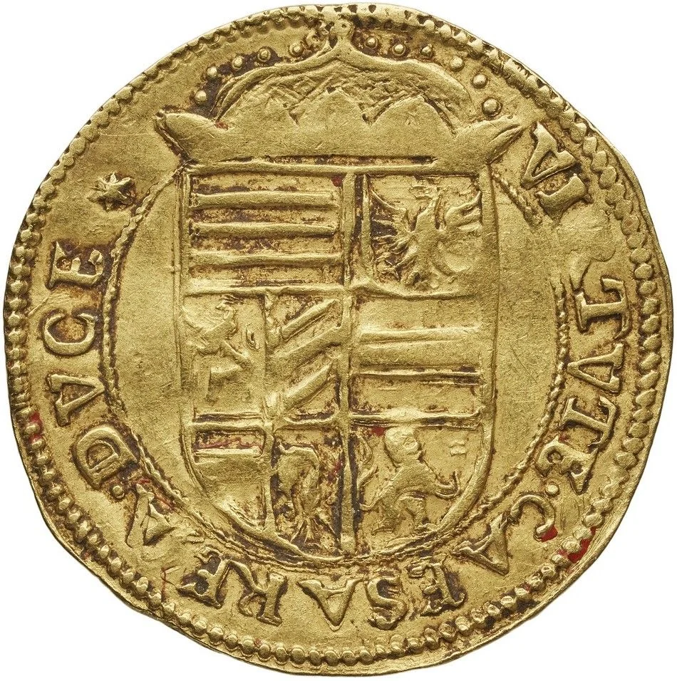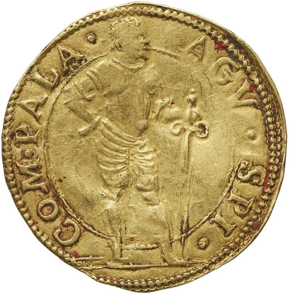 Full-length armored count facing right, holding a downward-pointed sword in his left hand.