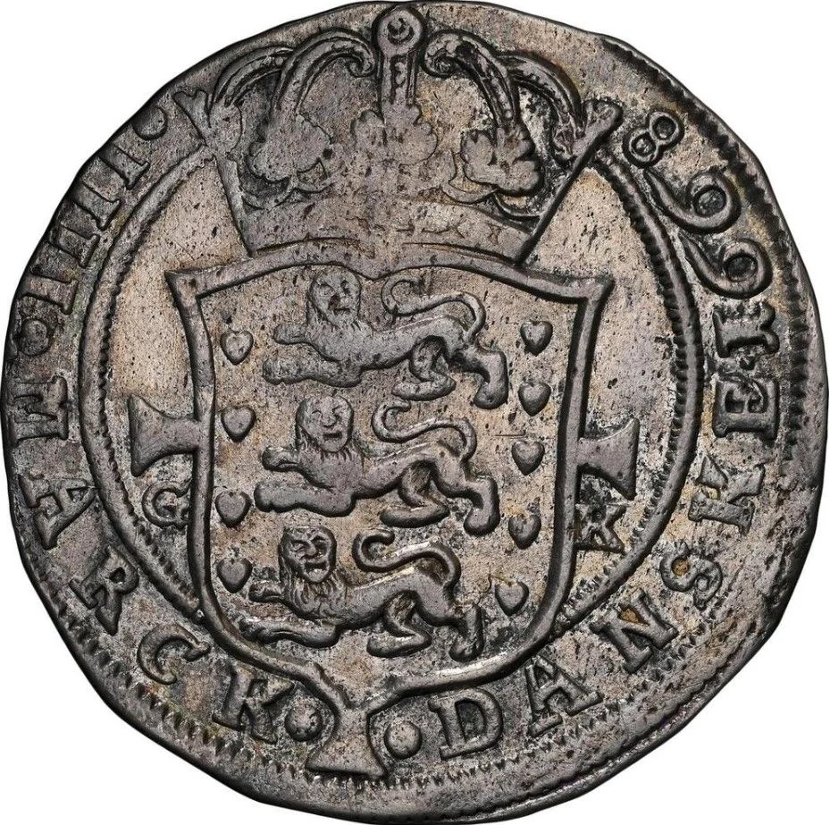 Danish crowned shield above cross in circle, mintmarks flanking. Legend with date reads counterclockwise from crown’s left.