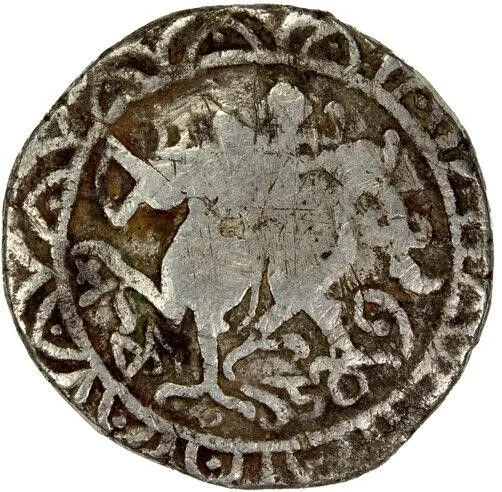 Tripura lion running left, lettering within an arched decorative border.