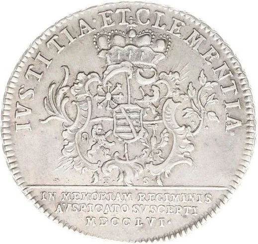 Description: Arms quartered with central shield in crowned baroque frame; mint official's initials below, three-line inscription with Roman numeral date in exergue.