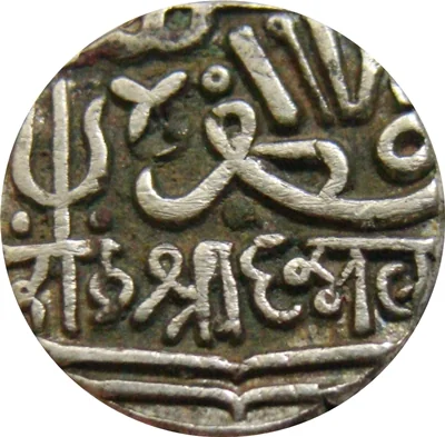 Trident. Urdu legend: 'As-sultan Muzaffar Shah'. AH date. Rao's name in Devnagari below.
