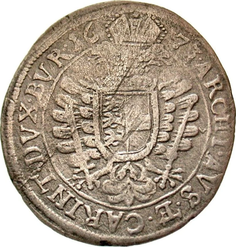 Half-armour laureate portrait of Leopold I facing right. Value in partial frame at 7 o'clock.