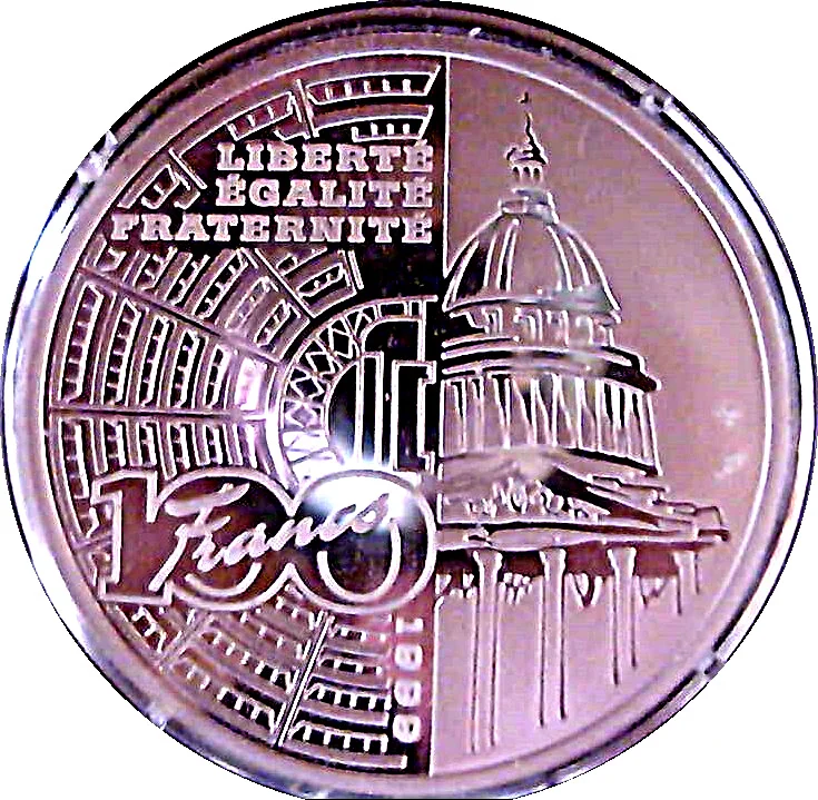 Left side (05–25 min): a hemicycle. Top: "LIBERTE EGALITE FRATERNITE." Bottom: crossed-out "100 francs" and "1999" at row ends, visible after a ¼ turn counterclockwise.