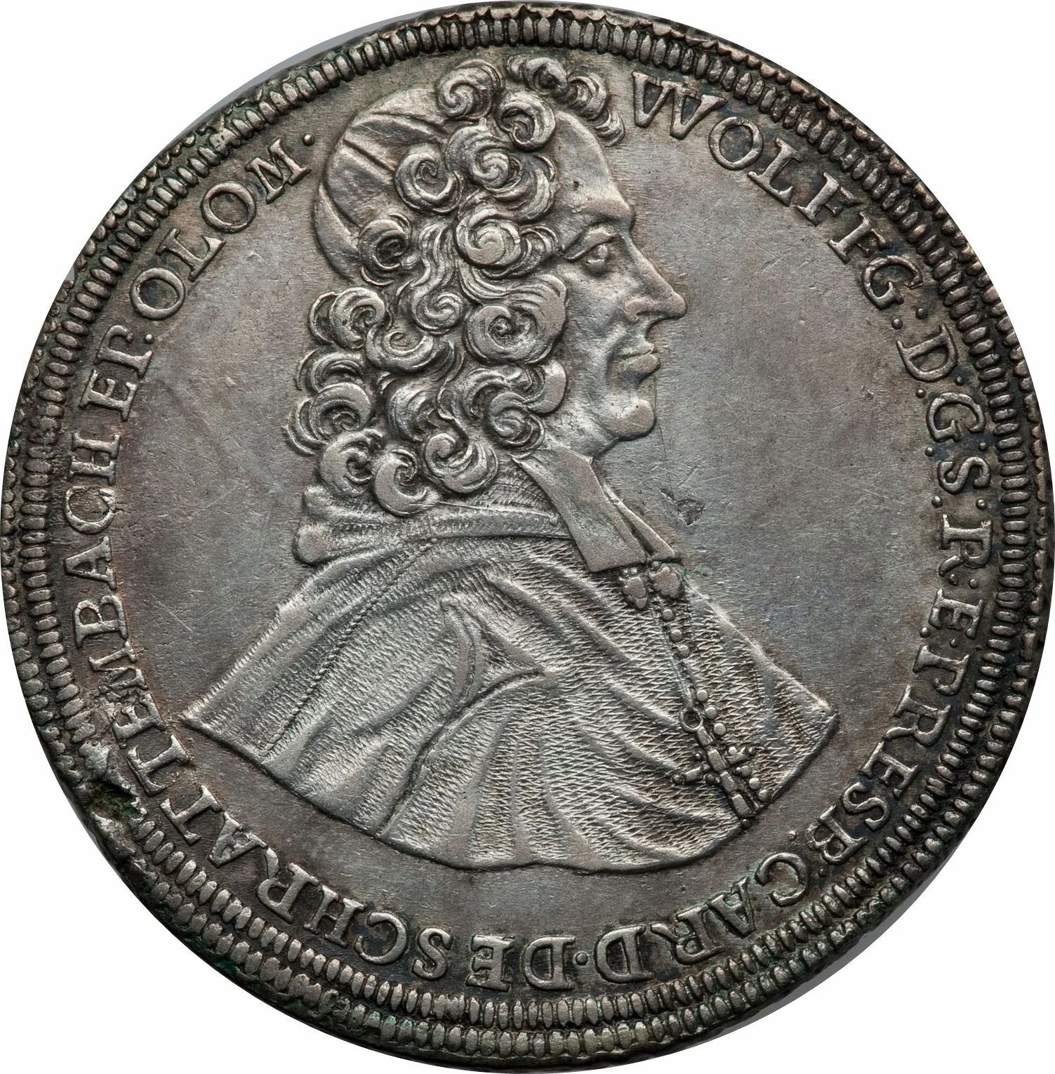 Description: Arms in an oval shield beneath a crown, mitre, and cardinal's hat. Legend (1h): "Duke of the Holy Roman Empire, Prince of the Royal Chapel of Bohemia, Count, Co-Protector of Germany, Intimate and Actual Councillor of the Imperial Roman Majesty."