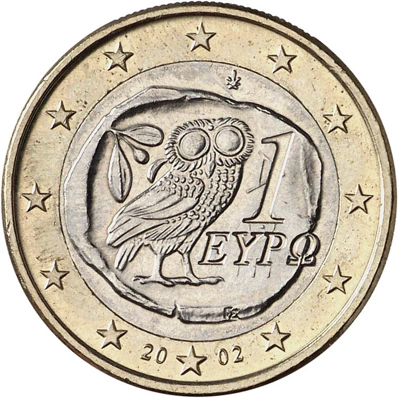 An antique Athenian tetradrachma owl reproduction, circa 490 BC, is encircled by Europe's twelve stars and shows its face value.