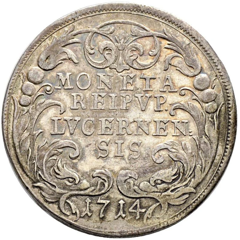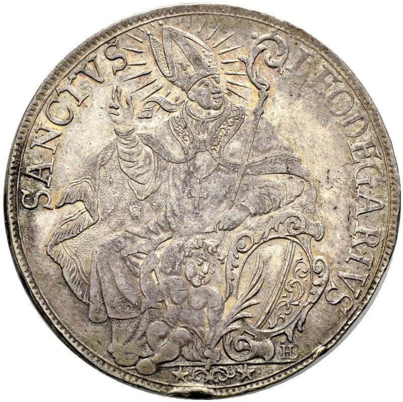 Saint Leodegar seated, blessing with his right hand and holding a crosier. A putto below holds a drill and palm leaf. The Lucerne coat of arms and an inscription complete the scene.