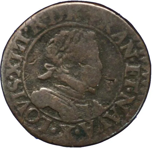 Childish bust of Louis XIII, laureate and draped, with right-side armor and a small flat collar; workshop letter at 6 o'clock.