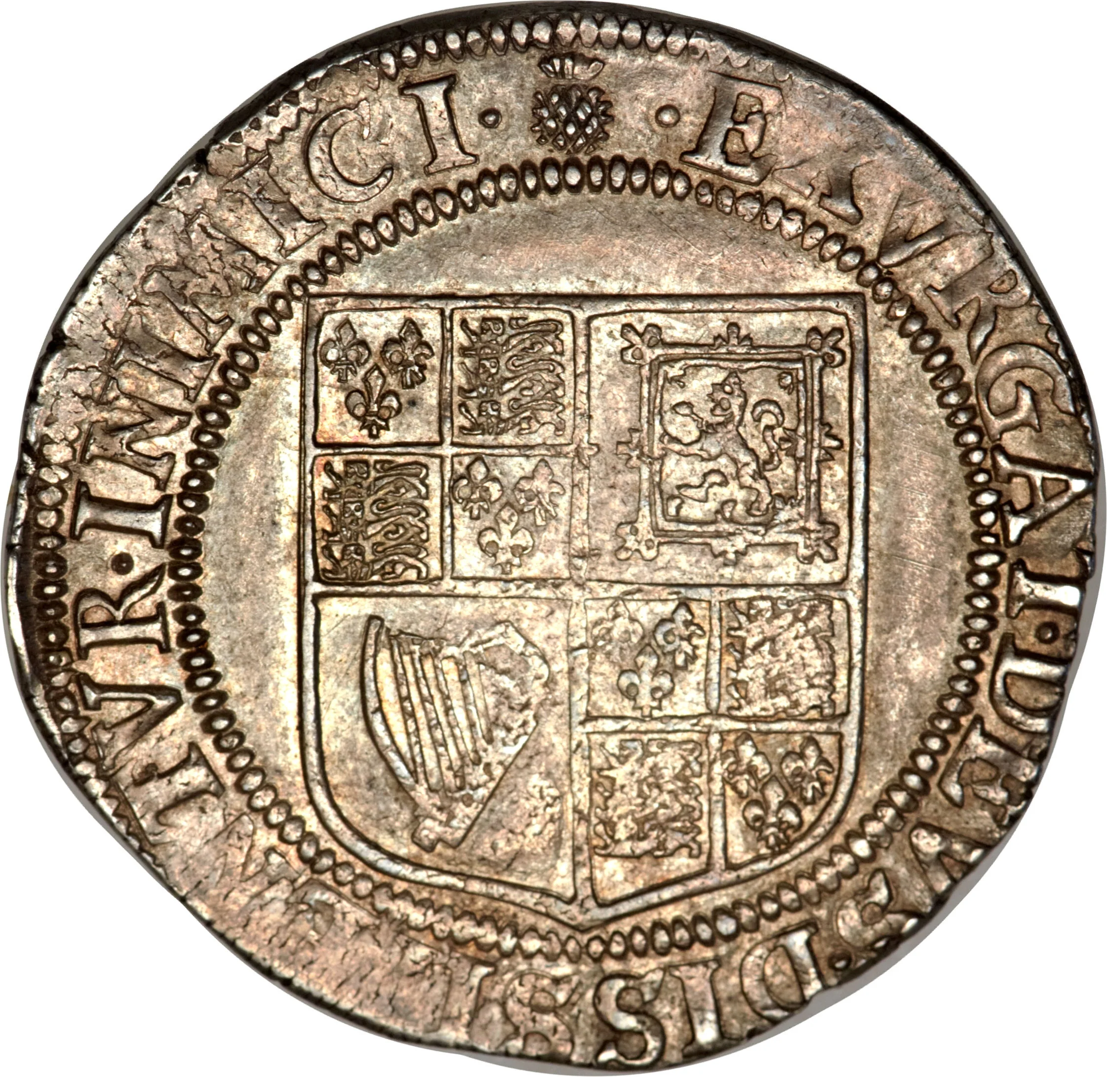 Quartered shield of England, Scotland, France, and Ireland within a circle, surrounded by legend and mintmark.