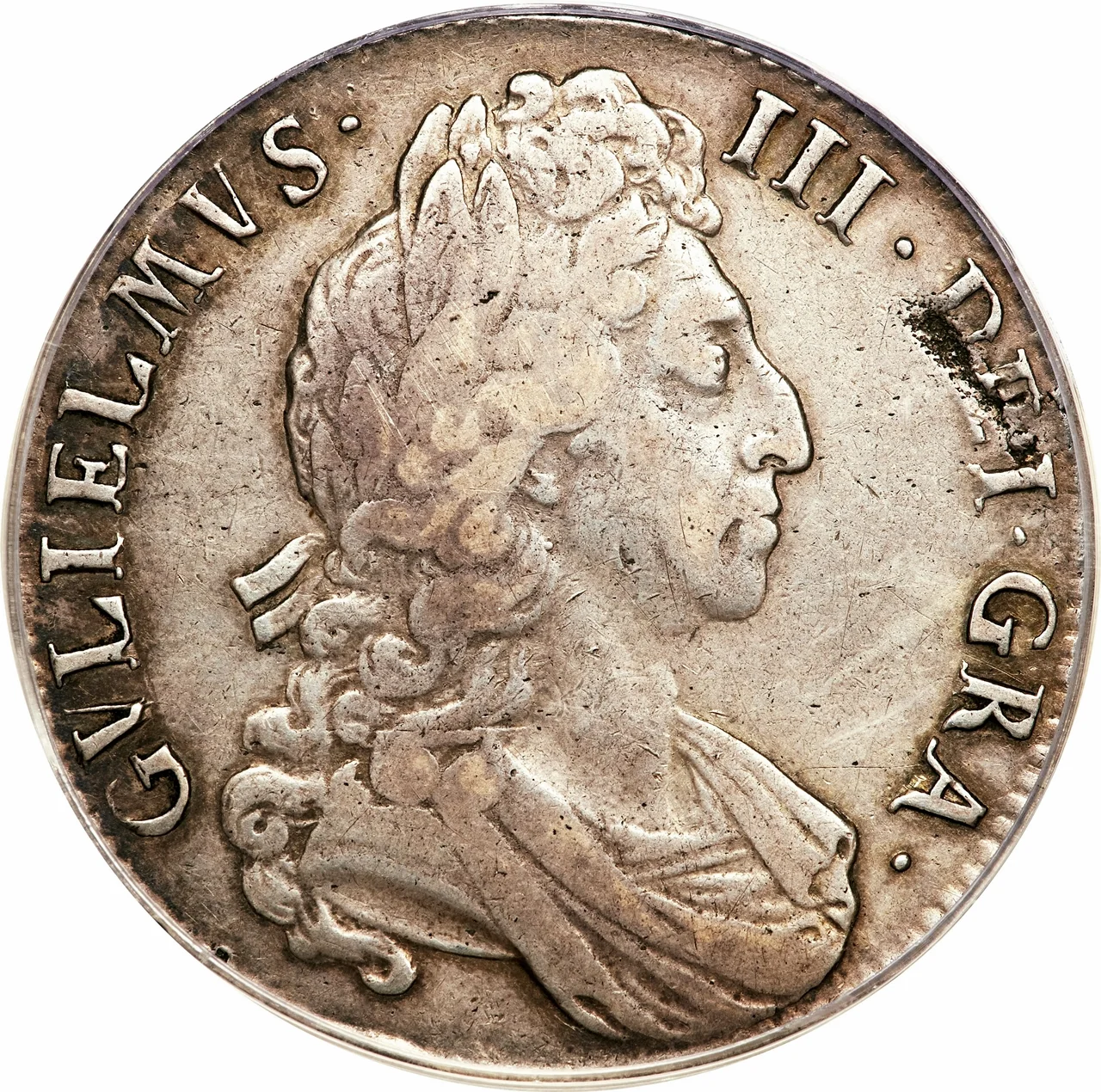 Third laureate, draped bust of William III right. Note: straight breastplate or drapery.