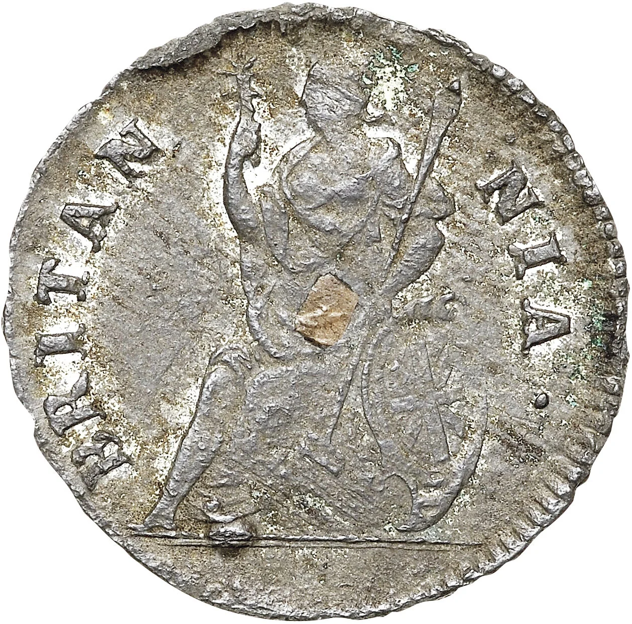 Britannia seated left, holding spear and olive branch, shield with Union flag beside her, legend around.