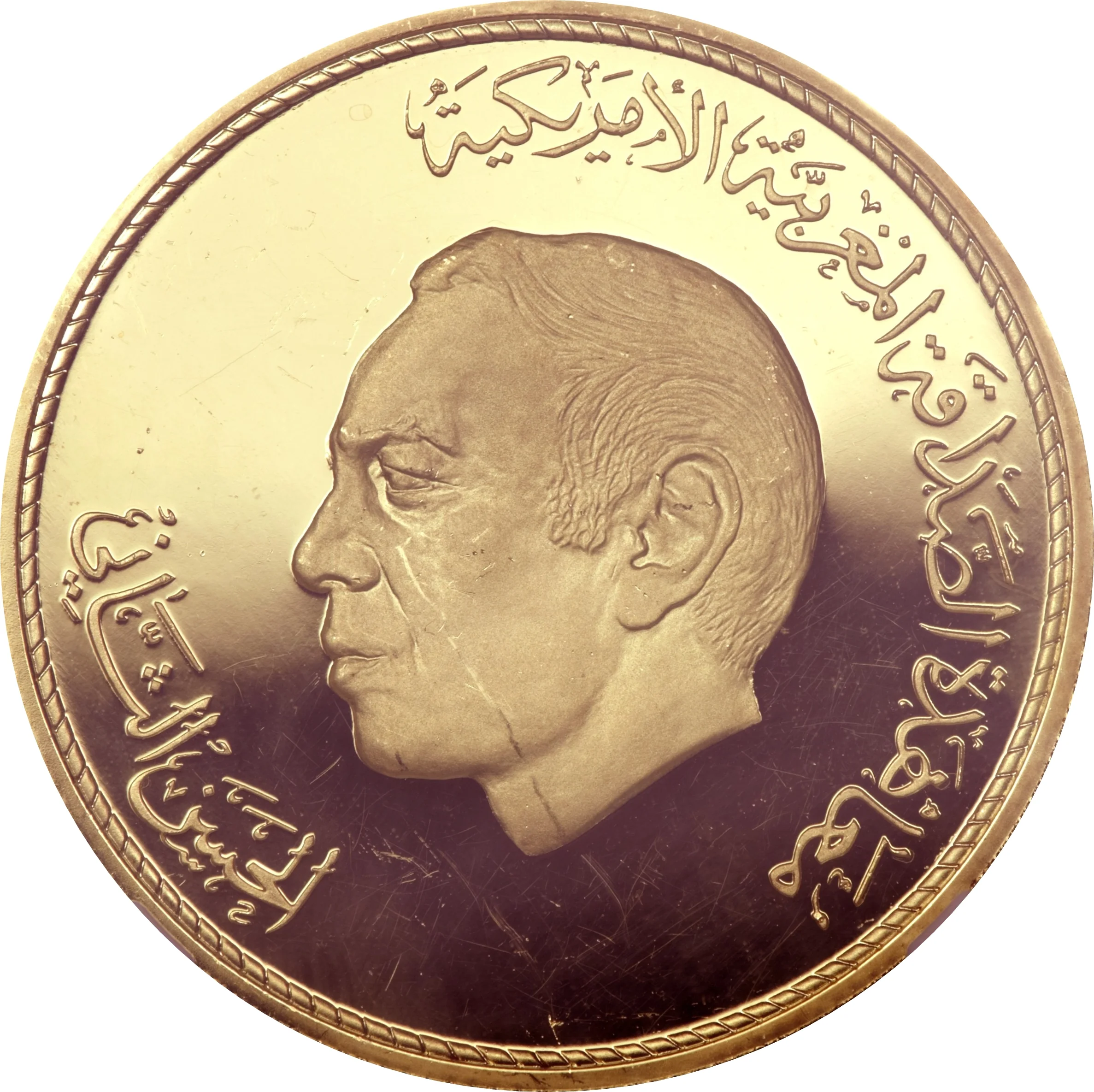 Radiant sun over crossed flags (US left, Morocco right), date above, value below.