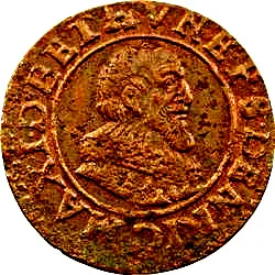 Bust of Maximilien de Béthune (Sully) facing right, wearing a ruff and ermine-trimmed coat. Smooth circle with legend beginning at 6 o'clock.