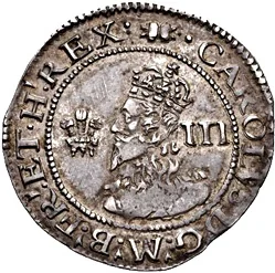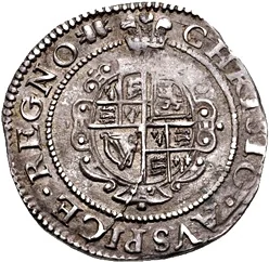 King Charles I left, crowned and mantled, with plumes left, denomination right, legend around.