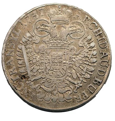 Eagle with angular legs; central shield displays the Transylvanian arms, flanked by titles of Archduke of Austria, Duke of Burgundy, and Prince of Transylvania.