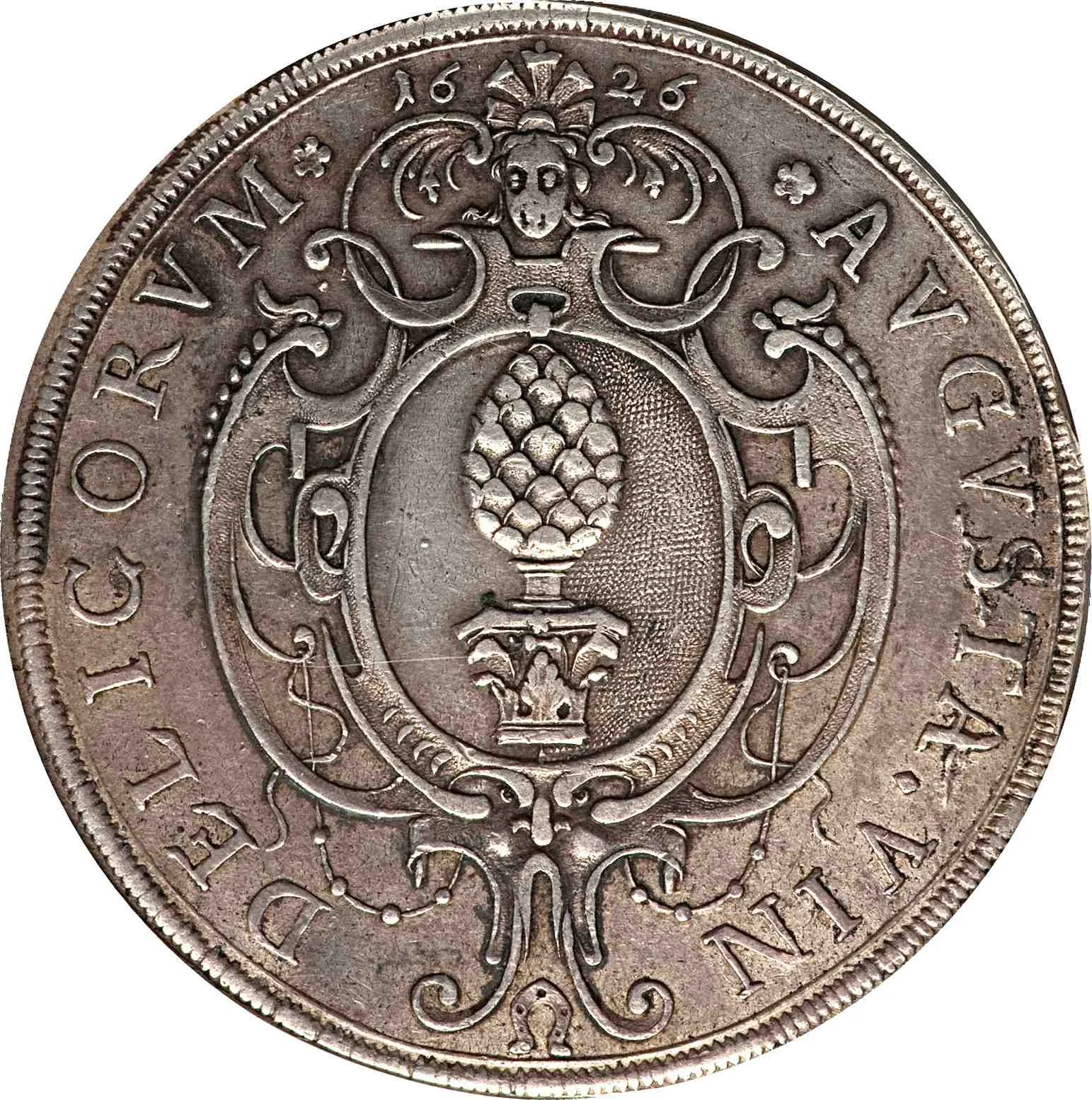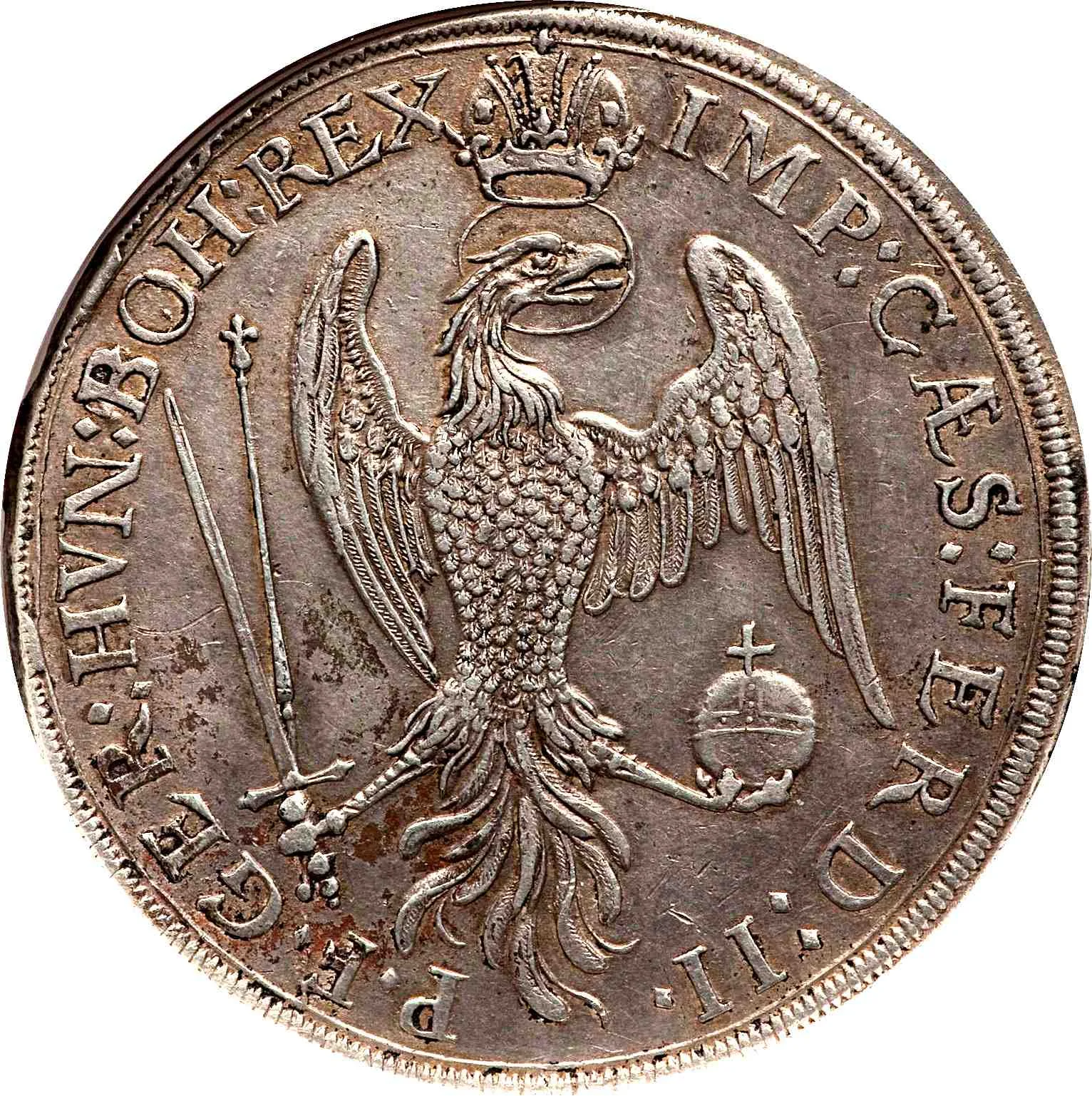 Eagle with spread wings, holding orb, sword, and scepter, bearing the titles of Ferdinand II.