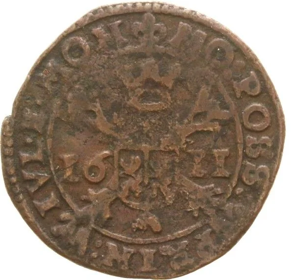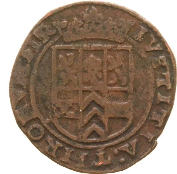 Burgundian cross with crowned Gelderland-Julich arms divides date.