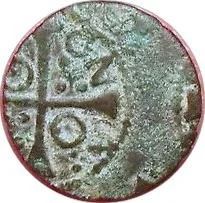 Greek cross divides legend; annulet in first and fourth angles, three bezants in second and third. Legend within beaded circle.