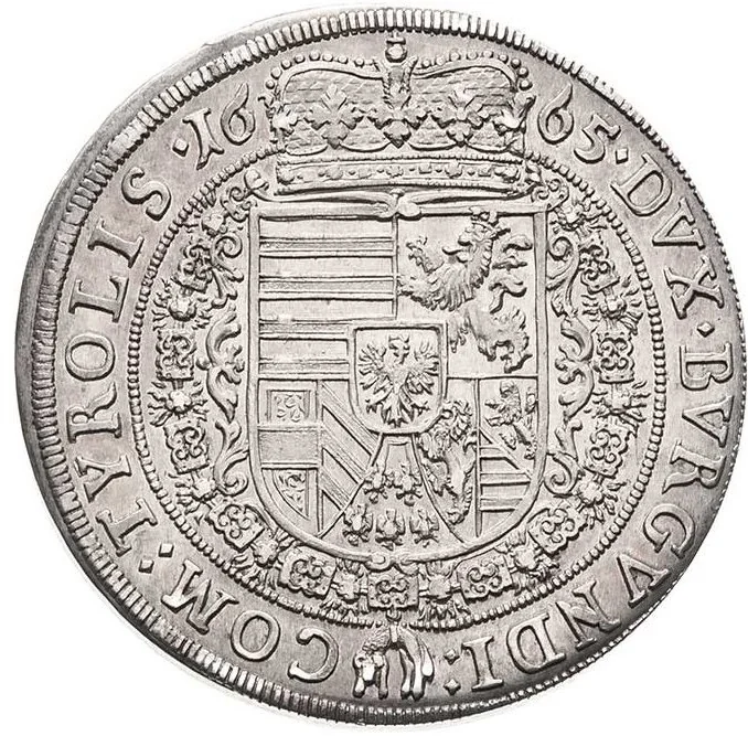 Shield with coat of arms and central Tyrol shield, encircled by the Order of the Golden Fleece chain. Arabesques flank the shield inside a beaded circle. Date and legend divided by crown.