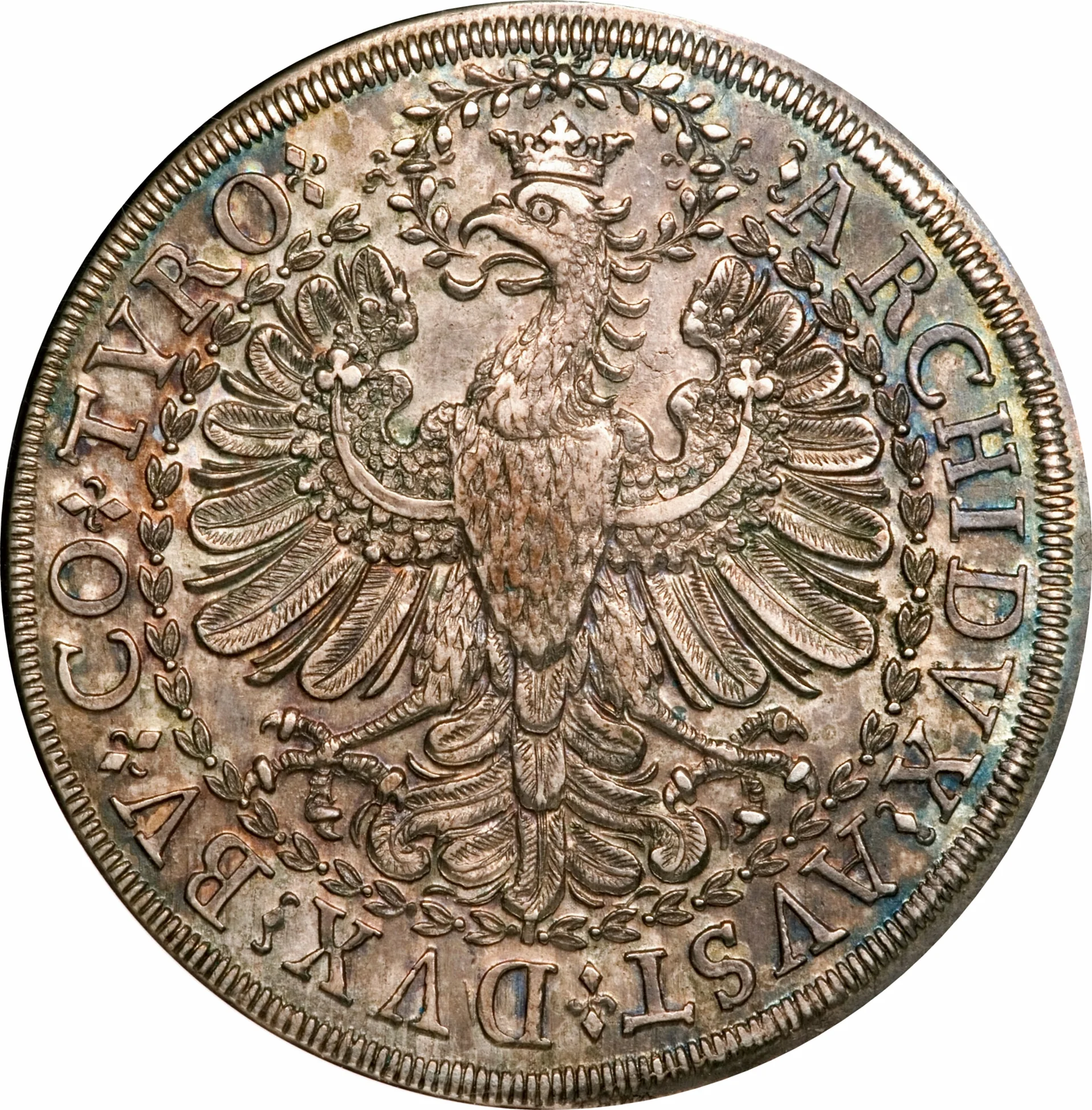 Tyrolean eagle facing left, haloed by large leaves, with oval feather patterning.