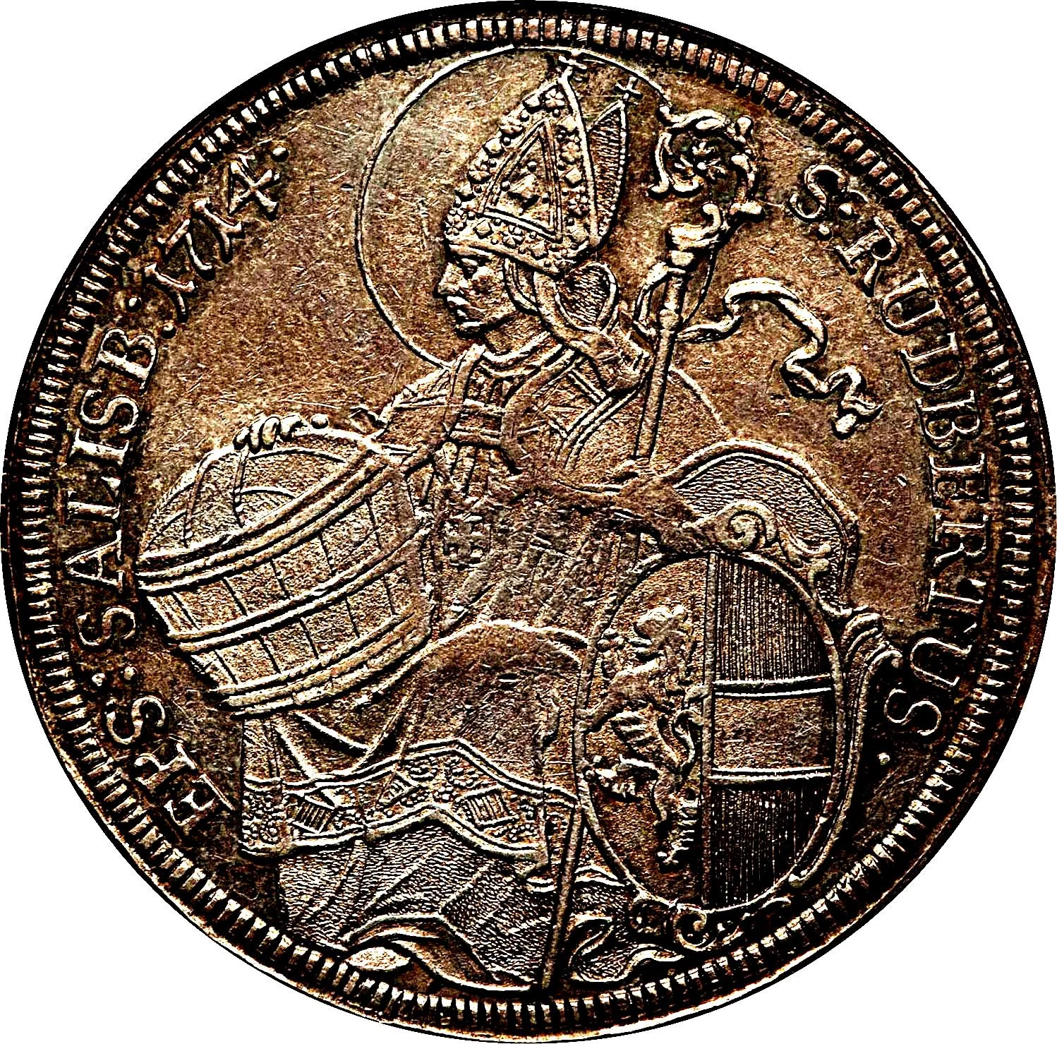 St. Rupert seated left, holding saltbox and crozier. Below right, the arms of Salzburg.