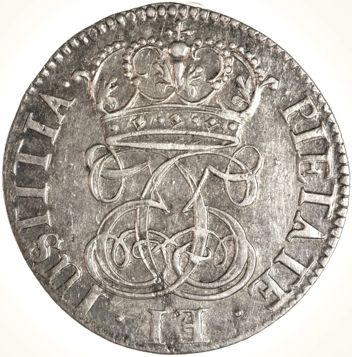 Crowned mirrored monogram of Christian V, encircled by inscription, with a beaded ring on the rim.