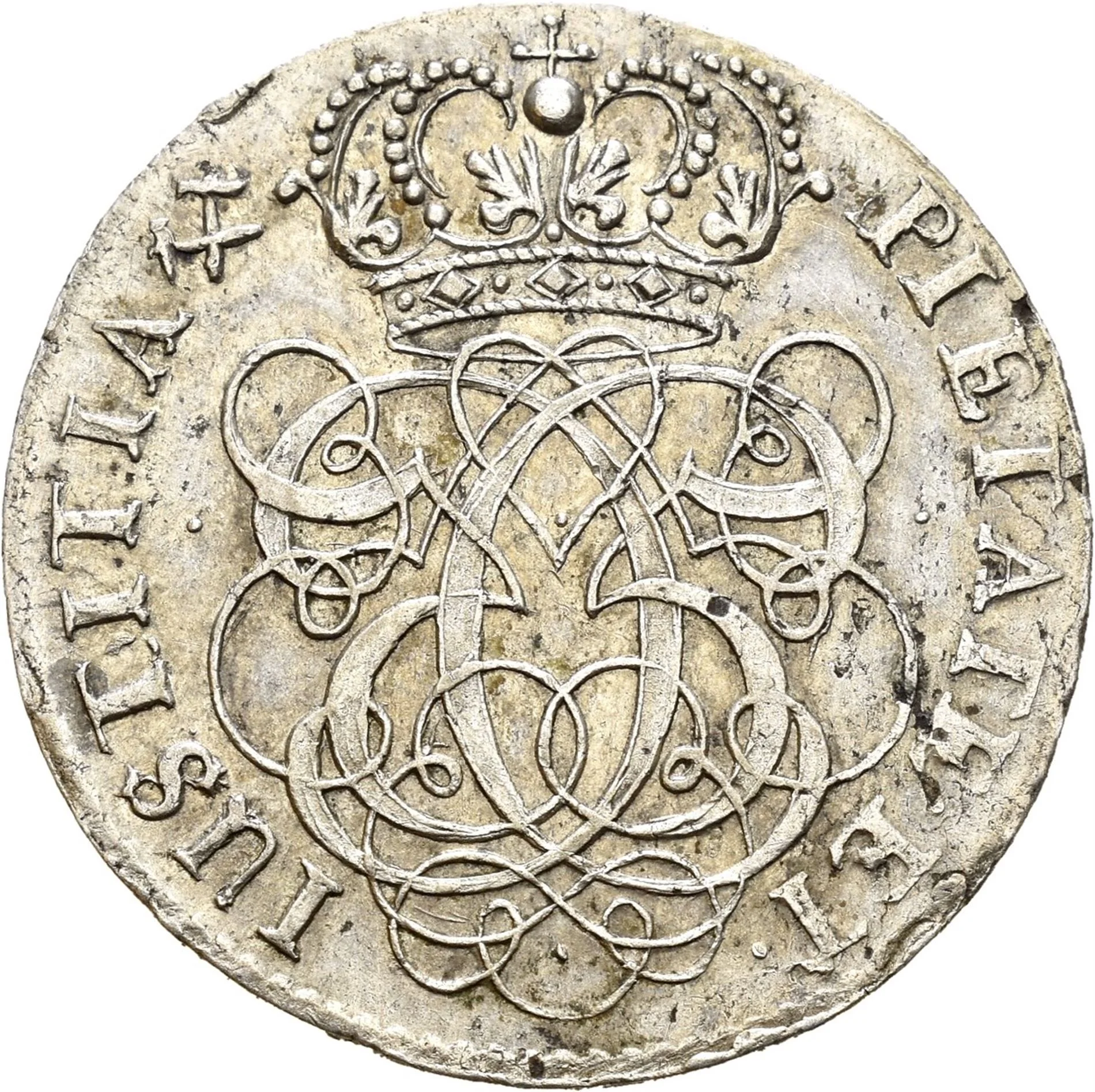 Crowned mirrored monogram of Christian V, encircled by inscription, with a beaded ring on the rim.