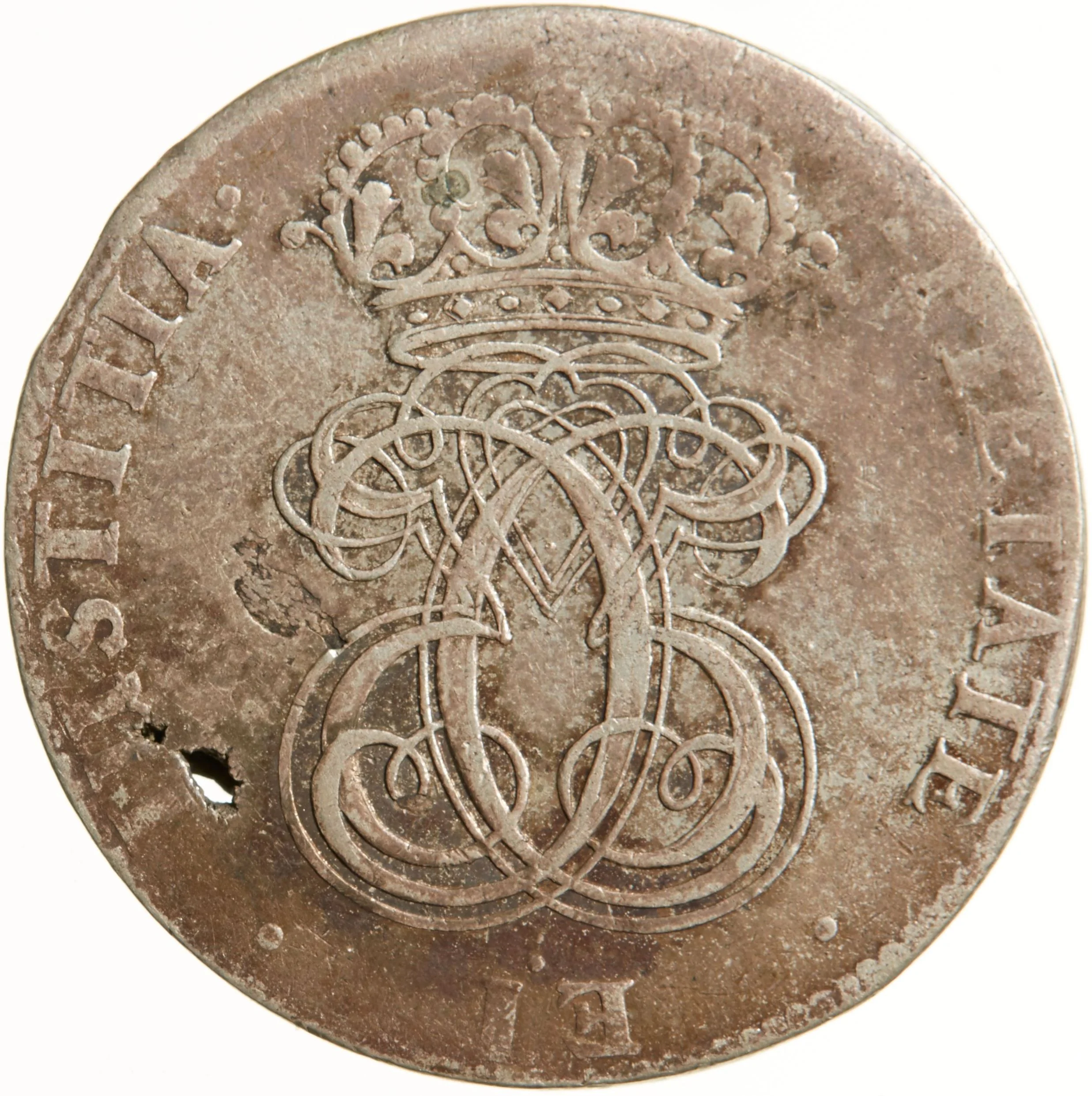 Crowned mirrored monogram of Christian V, encircled by inscription, with a beaded ring on the rim.