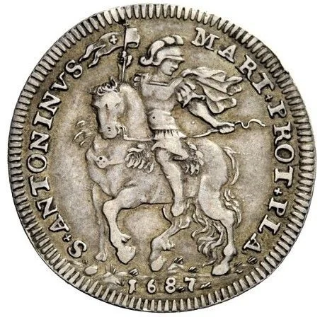 Saint Antoninus on horseback, facing left but looking right, holding a pennant; date below.
