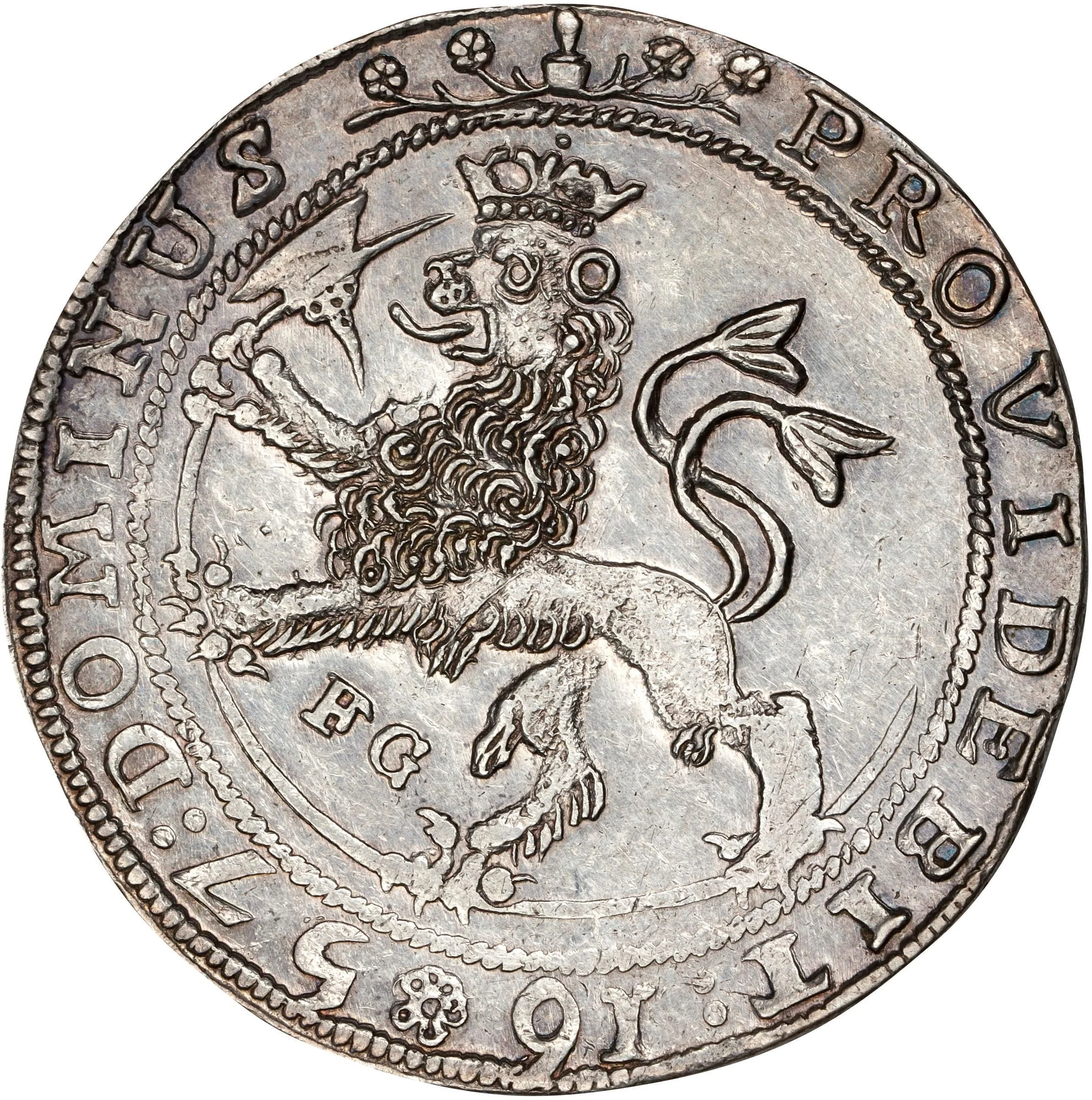 Crowned two-tailed lion rampant left, holding a curved halberd, within a beaded circle. Inscription surrounds, with mintmark among four flowers. Outer beaded border.