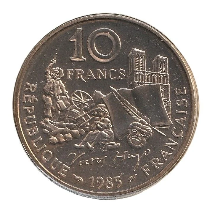 An open book with a quill, a theater mask, and elements from Hugo's novels like Notre-Dame, a barricade with Gavroche, and Cosette, alongside his signature. The circular border reads "RÉPUBLIQUE FRANÇAISE" with the value above.
