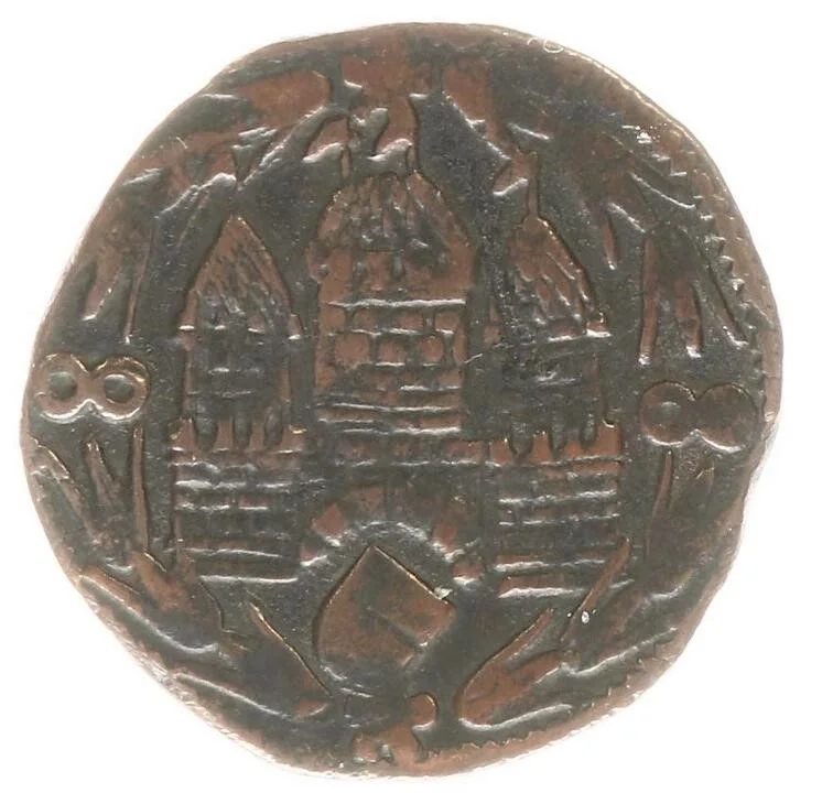 City gate in tulip wreath, shield inside. Three-line inscription with city name and date in tulip wreath.