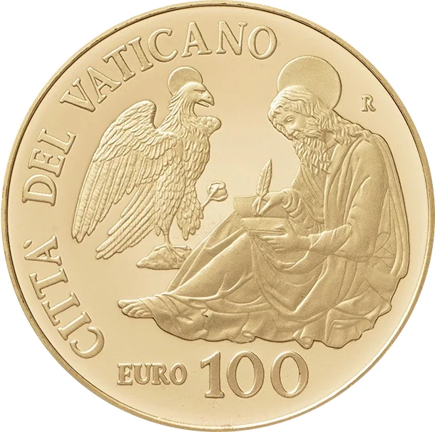 The coin depicts the Saint with an eagle, symbolizing his gospel's gaze into the divinity of Christ. This design replicates one of Andrea della Robbia's ceramic Evangelists in the Basilica of Santa Maria delle Carceri in Prato.