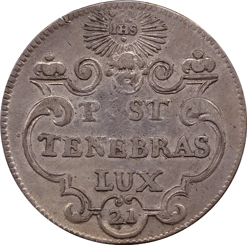 Arms in cartouche, radiant sun with IHS above, date below.