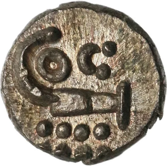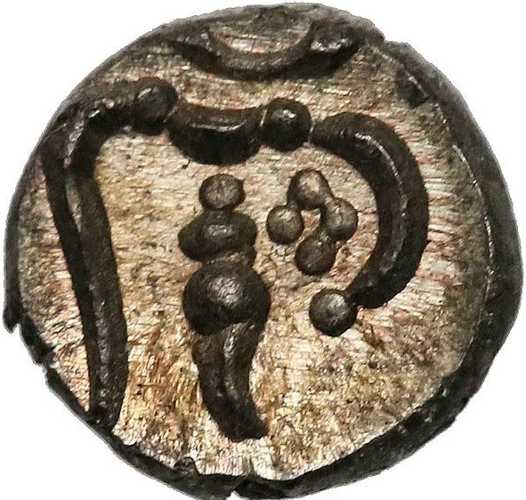 Lord Vishnu as Padmanabhaswamy beneath the VOC monogram, above three rows of four dots.
