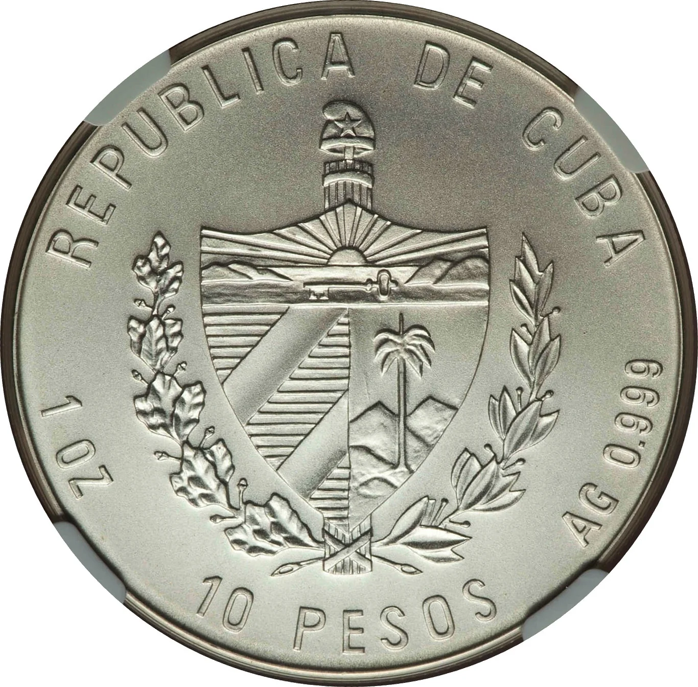 Cuban coat of arms with curved country name above, face value below, and weight and fineness on the sides.