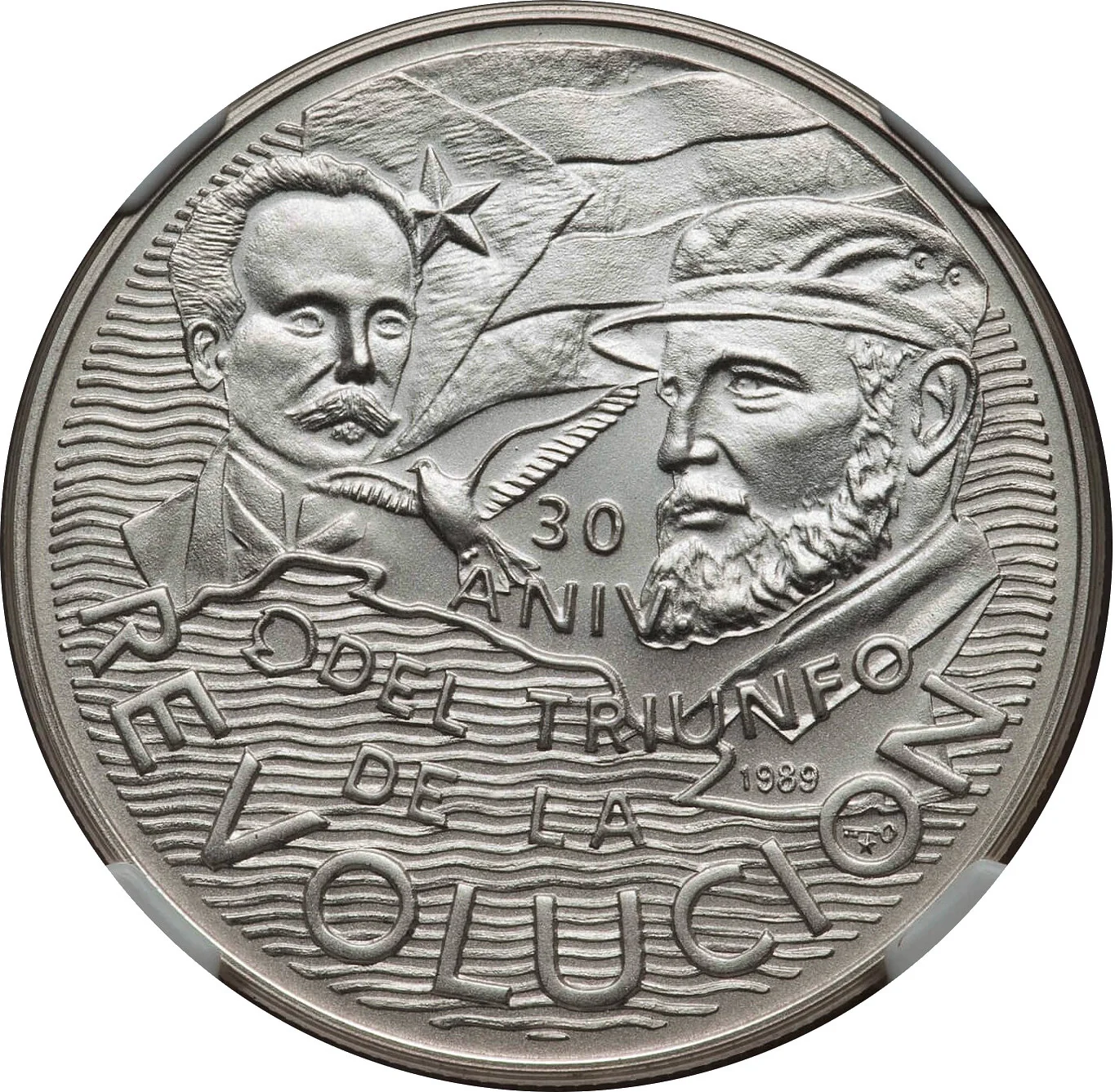 Martí left, Castro right, Cuban flag above with dove between them. Cuba’s southern shore below, wavy lines for the Caribbean. Five-line legend below, year under Castro, mintmark in final "O."