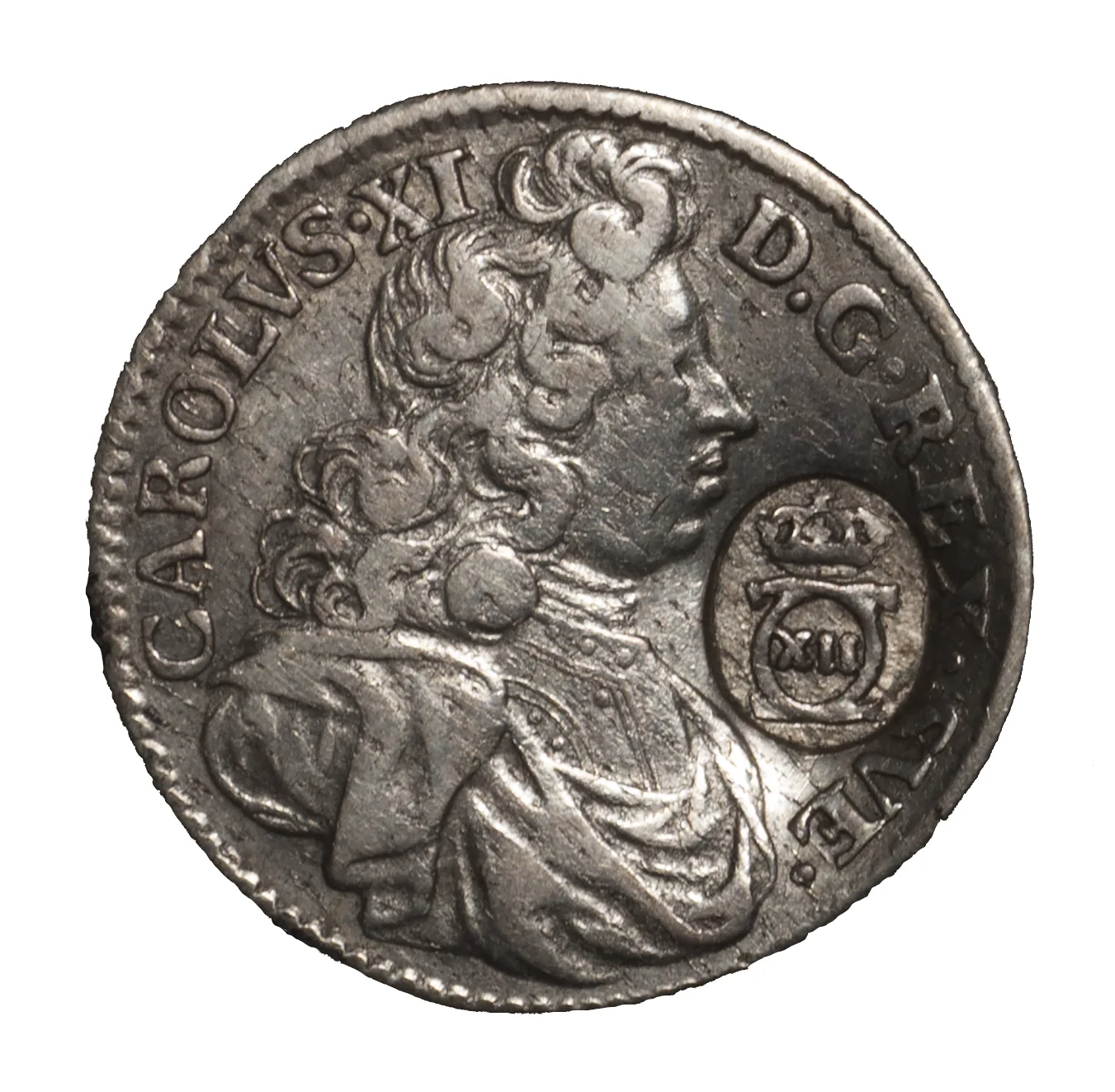 Bust of King Karl XI, facing right. Note: Bust shape and size may vary.