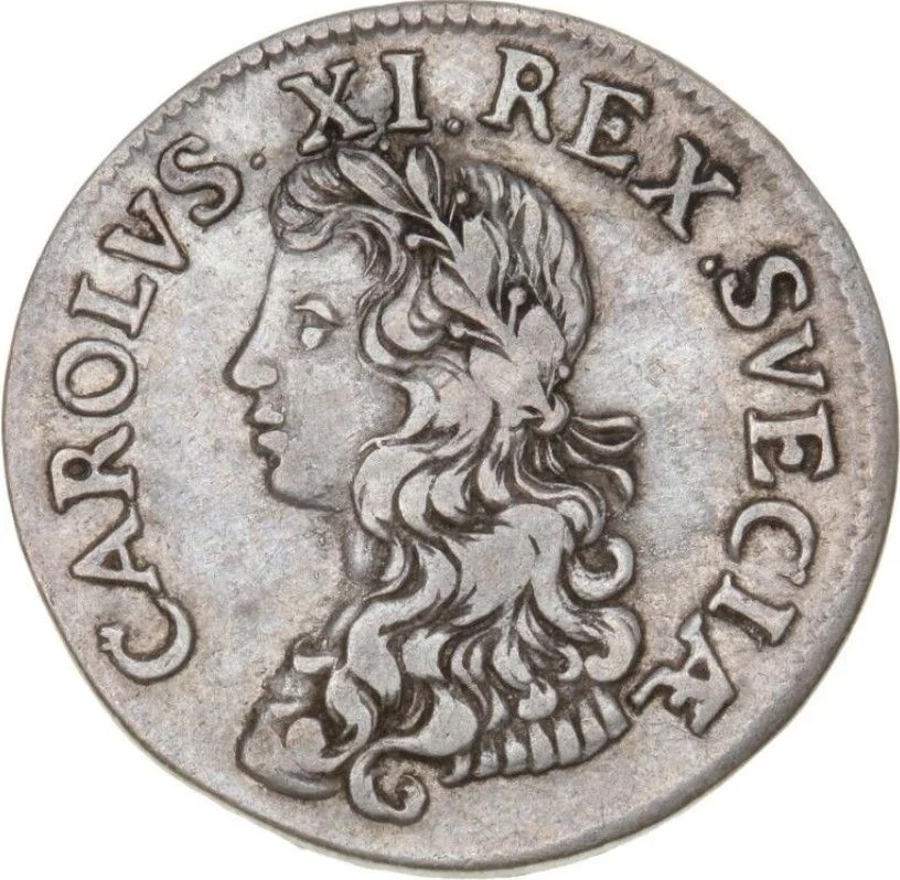 Carl XI facing left. Types: I) Poorly defined bust touches rim, continuous legend. II) Long flowing hair, continuous legend. III) Small curly hair, continuous "REX·SVECIÆ". IV) Small curly hair, divided "REX.SVECIÆ".