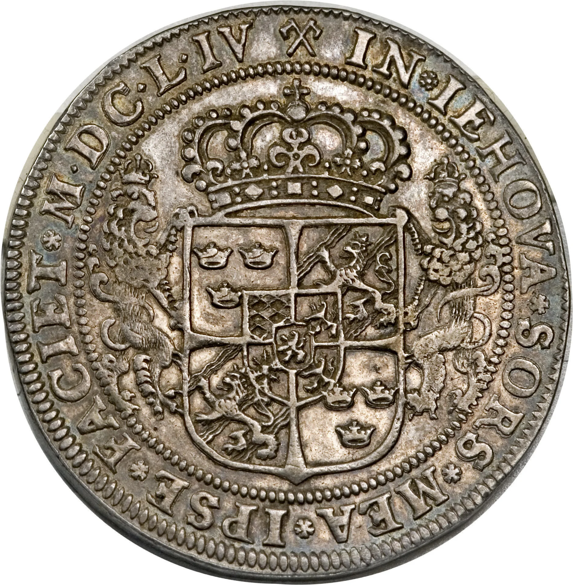 Swedish crowned shield flanked by lions within a beaded circle, surrounded by a legend and date in Roman numerals.