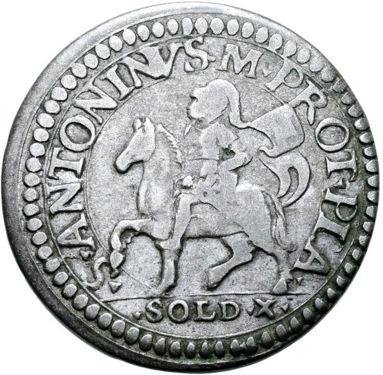 Saint Antoninus on horseback left, holding pennant; value below.