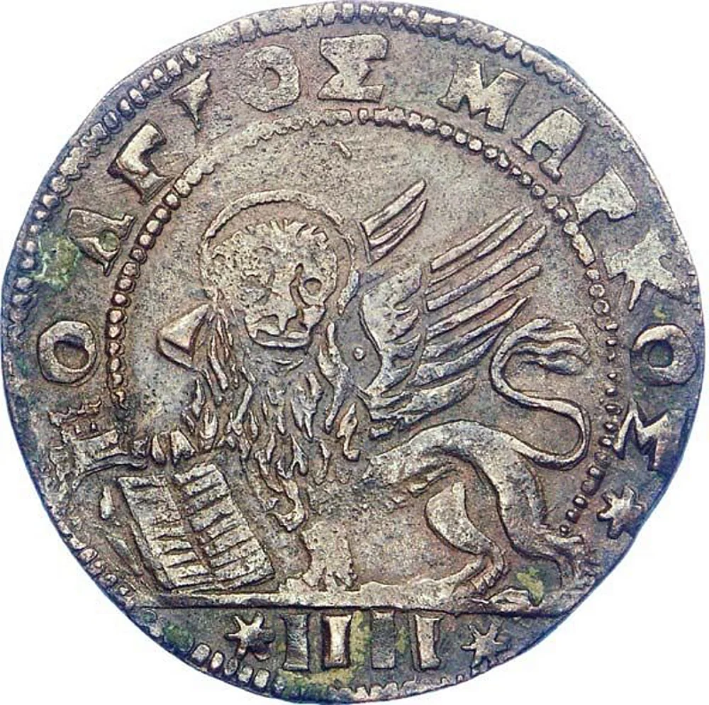St. Mark's lion left, facing, paw on open book, 'IIII' below.