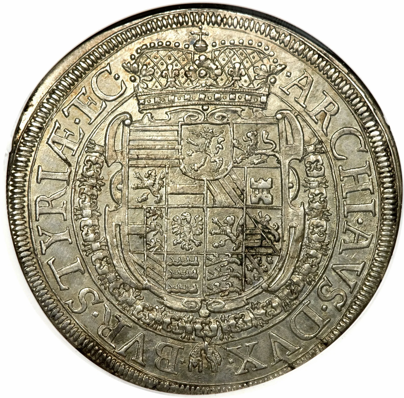 Crowned arms in a flat-topped shield with a small Styrian panther shield above, framed baroquely with the Golden Fleece chain. The crown breaks the circular legend, which begins at 1 o'clock: "Archidux Austriae Dux Burgundiae Styriae Etc".