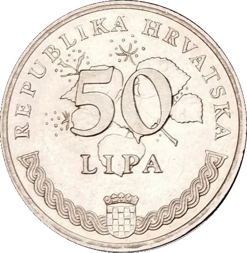 A stylized linden branch forms the central design, with the value "50" on its leaves and "LIPA" below. "REPUBLIKA HRVATSKA" arches above, while the Croatian coat of arms sits below, flanked by old Croatian braided ornaments.