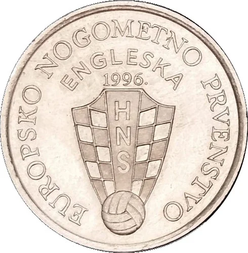The coin's center features the Croatian Football Organisation logo, above which is "ENGLESKA 1996." The edge is inscribed "EUROPSKO NOGOMETNO PRVENSTVO" (European Football Championship).