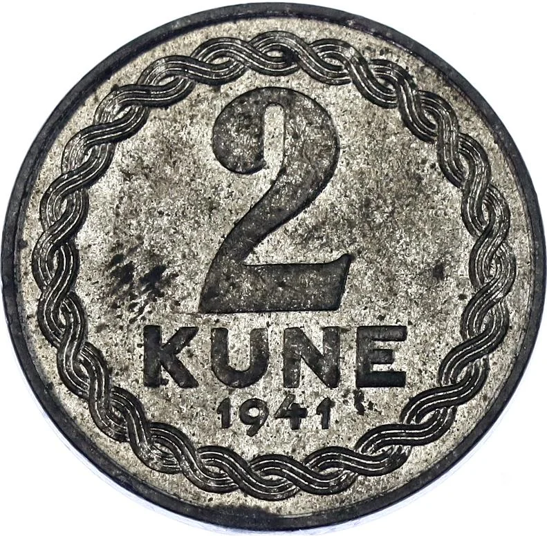 The coin's edge features a Christian braided pattern, with its central face value "2 KUNE" above the mint year 1941.