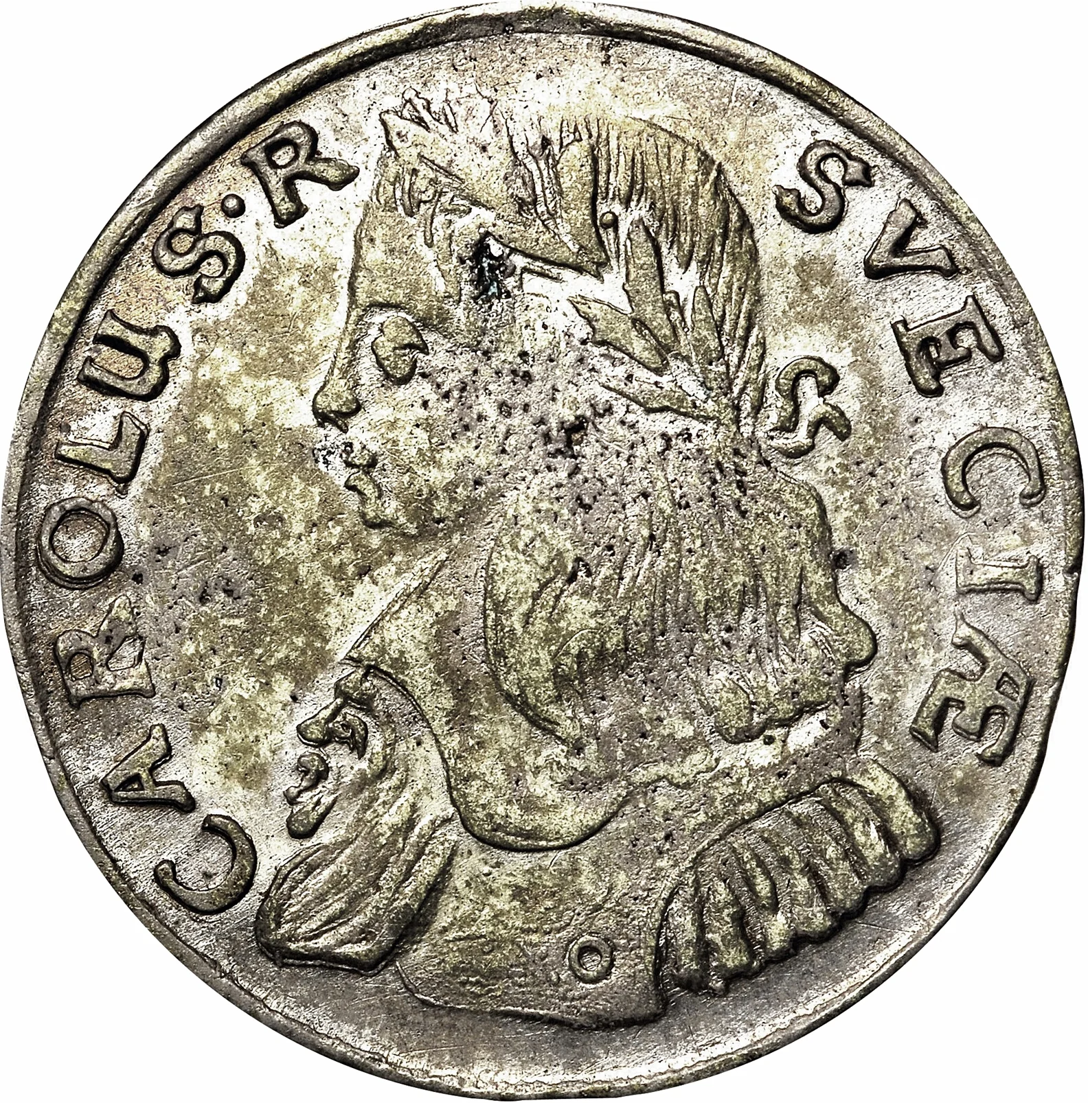 Half-length figure of Carl XI facing left. Five types: I) High bust, elegant robe, divided legend. II) High bust, elegant robe, continuous "REX SVECIÆ". III) High bust, scarf, continuous "REX SVECIÆ". IV) High bust, elegant robe, continuous "REX SVEIÆ" with large dots. V) High bust, elegant robe, larger laurel, continuous "REX SVECIÆ".